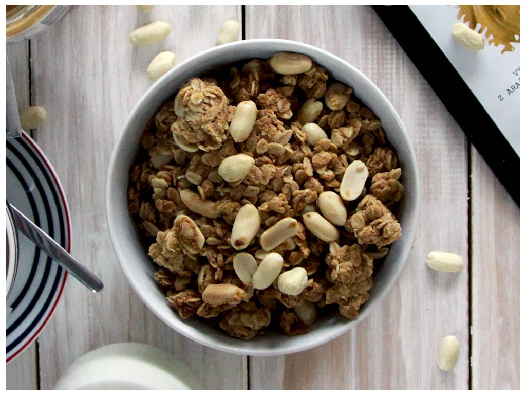 Táto granola je pripravovaná z BIO ovsených vločiek, arašidového masla, arašidov natural, javorového sirupu, panely a s množstvom lásky.
