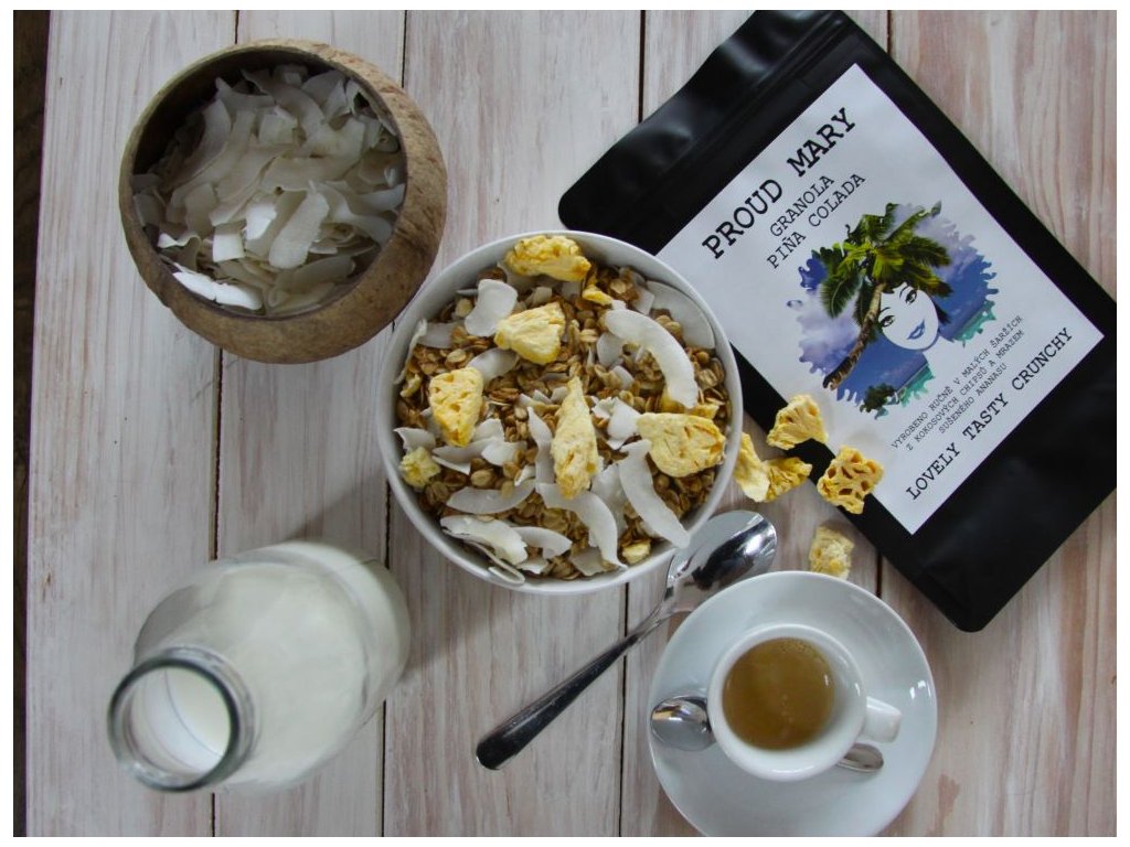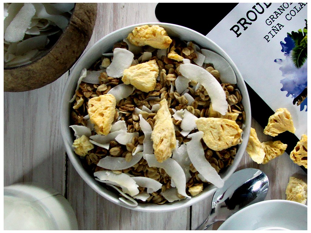 ZLOŽENIE: BEZLEPKOVÉ OVSENÉ VLOČKY BIO, KOKOSOVÉ CHIPSY, LYOFILIZOVANÝ ANANÁS, BIO KOKOSOVÝ OLEJ, JAVOROVÝ SIRUP, PANELA