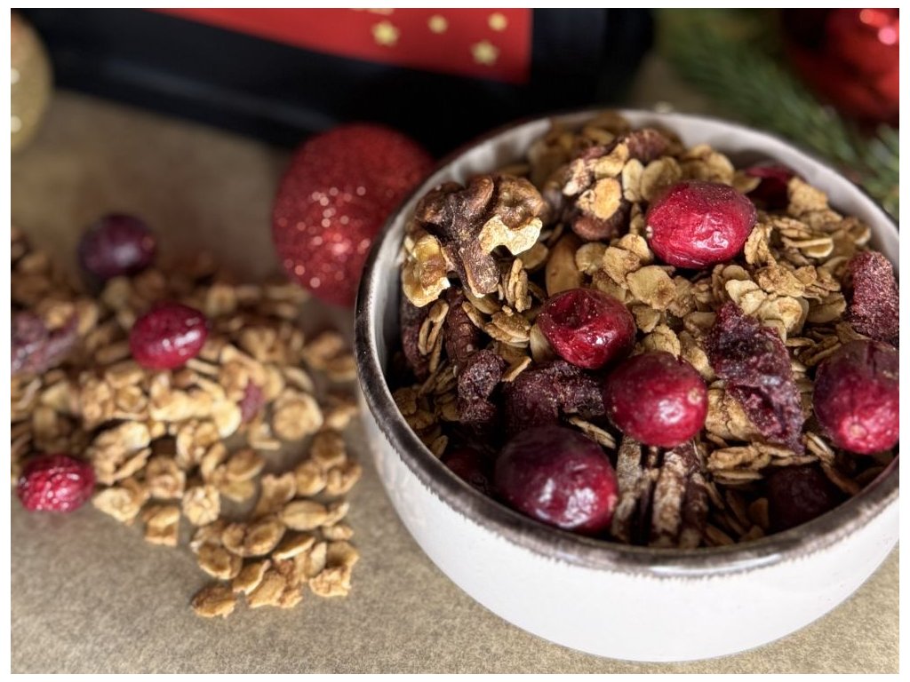 ZLOŽENIE: OVSENÉ VLOČKY BIO, SUŠENÉ BRUSINKY, LYOFILIZOVANÉ BRUSINKY, VLAŠSKÉ ORECHY, PEKANOVÉ ORECHY, MANDLE, GHI PREPUSTNÉ MASLO, JAVOROVÝ SIRUP, PANELA, VIANOČNÉ KORENIE